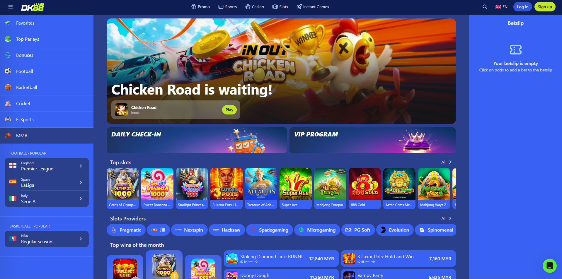 Bahagian slot laman Dashking88 menampilkan tajuk dari Pragmatic Play, Jili, Nextspin, Hacksaw Gaming, Spadegaming, Microgaming, PG Soft, Evolution dan Spinomenal. Permainan disusun ke dalam koleksi Top Slots dan Asian Slots. Tapis mengikut julat taruhan (0.01 MYR hingga 500+ MYR setiap putaran), volatiliti, RTP, pembekal atau ciri (pusingan percuma, pengganda, megaways). Tajuk popular termasuk Gates of Olympus 1000, Sweet Bonanza 1000, Starlight Princess 1000, SuperAce, Mahjong Dragon, 888 Gold, Aztec Gems Megaways dan Mahjong Ways 2.
